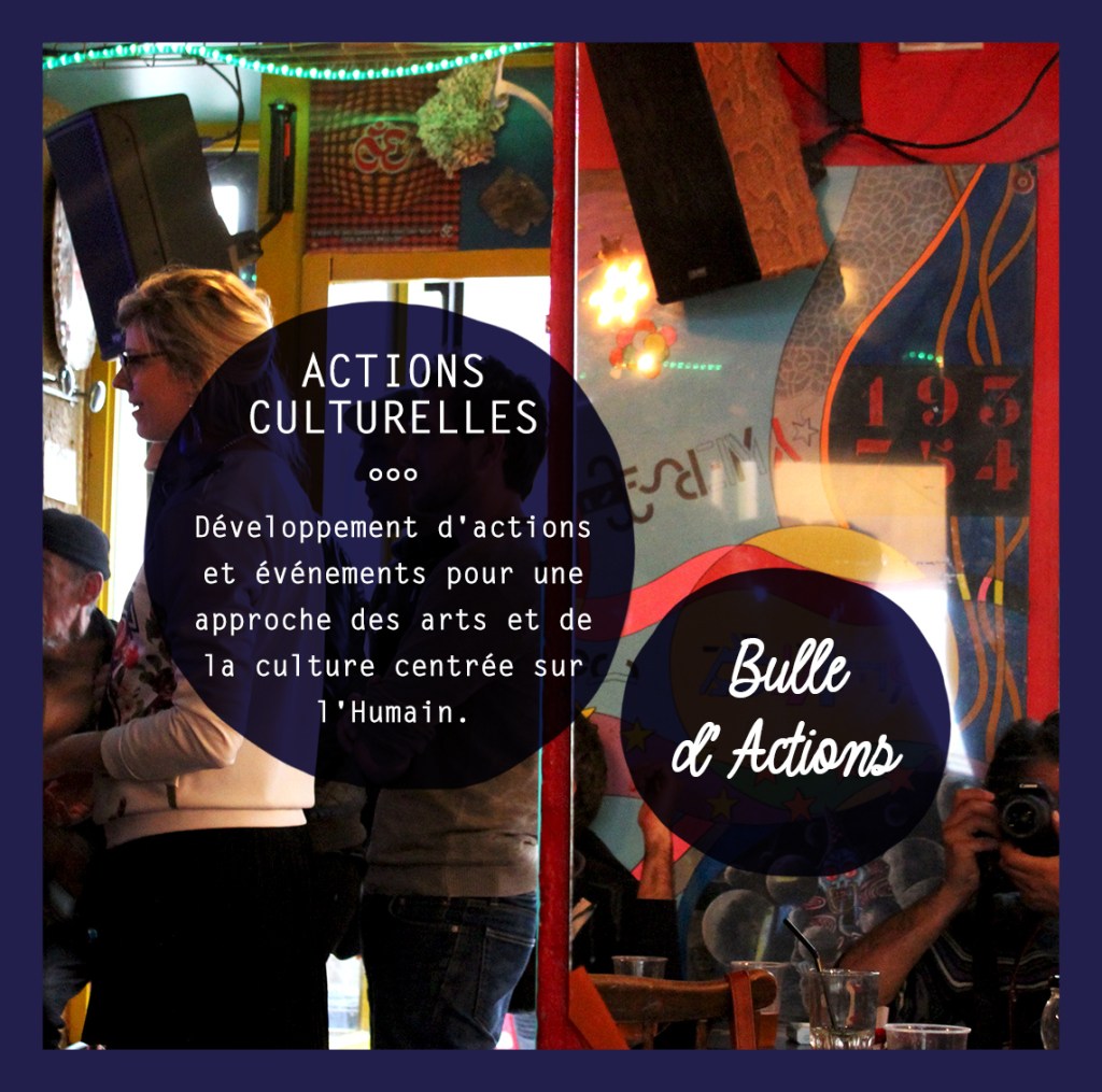 Bulle d’Actions propose ainsi des événements artistiques, littéraires ou culturels qui rassemblent, qui fédèrent ou divisent, qui font réagir, rêver, voyager, etc. L’objectif principal étant d’insister sur la préoccupation sociale et sociétale de toute action culturelle proposée. Aller plus loin qu’une mission d’éveil, d’information ou de sensibilisation.