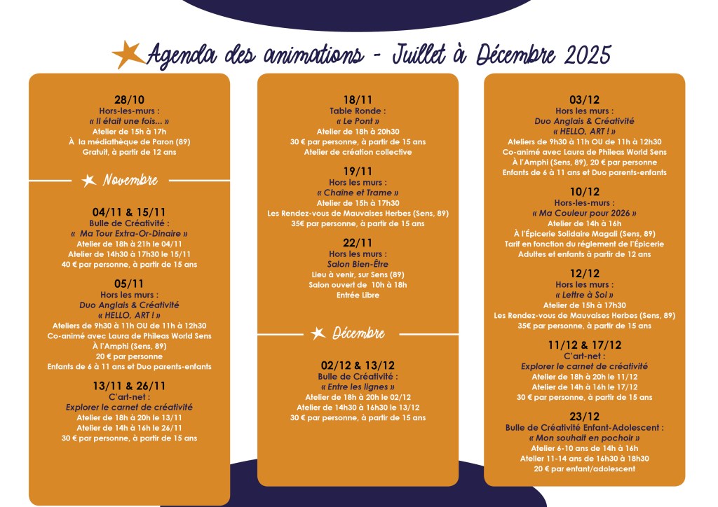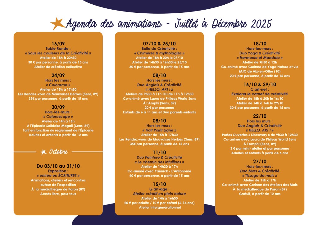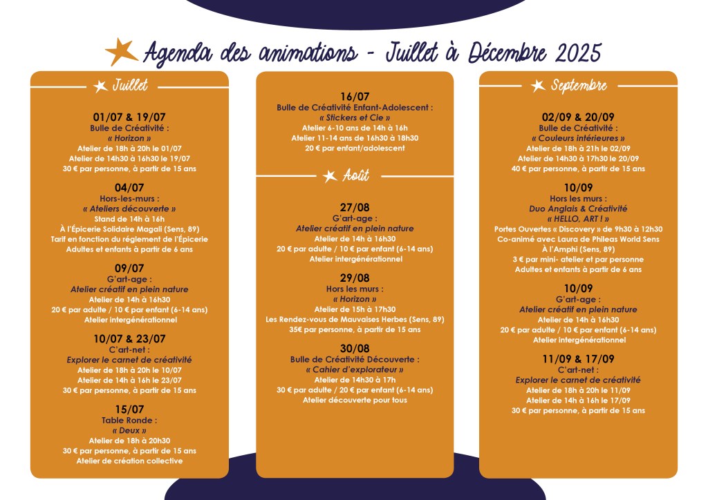 Le voici, le voilà, le programme des animations de l’Atelier Bulle Étoilée, pour la période de Juillet à Décembre 2025 !