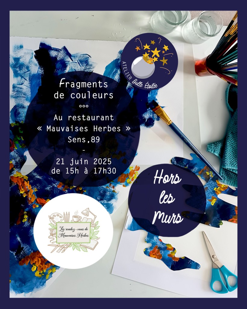 Prochain atelier Hors-les-Murs – Bulle de Créativité : « Fragments de Couleurs », le 21 juin 2025 de 15h à 17h30.