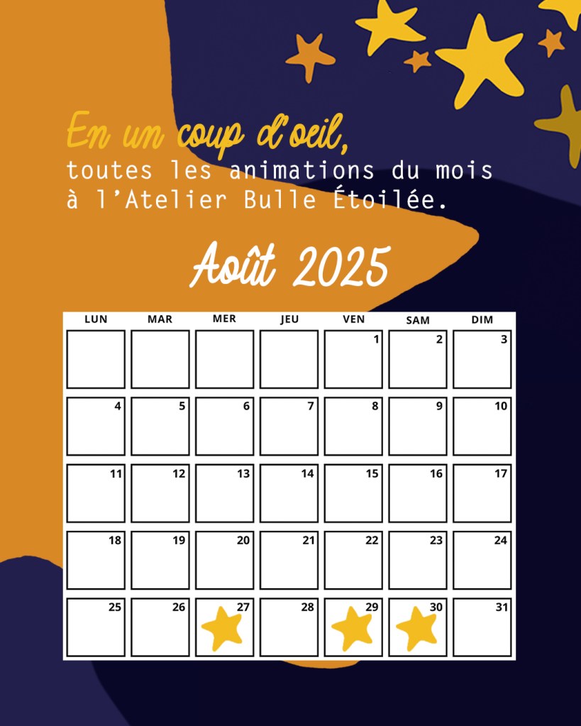 Il se peut que des événements surprise soient ajoutés au cours du mois : pour ne pas les manquer, consultez régulièrement le site internet ainsi que les pages Facebook et Instagram de l’Atelier Bulle Étoilée.