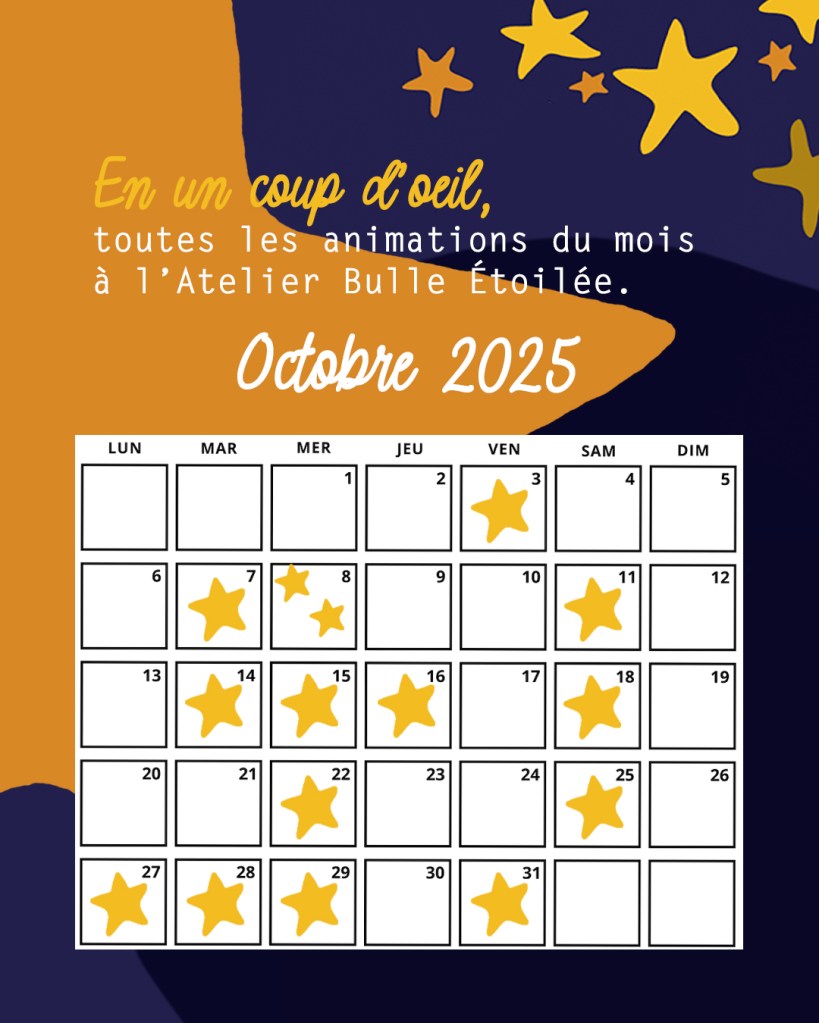 Il se peut que des événements surprise soient ajoutés au cours du mois : pour ne pas les manquer, consultez régulièrement le site internet ainsi que les pages Facebook et Instagram de l’Atelier Bulle Étoilée.