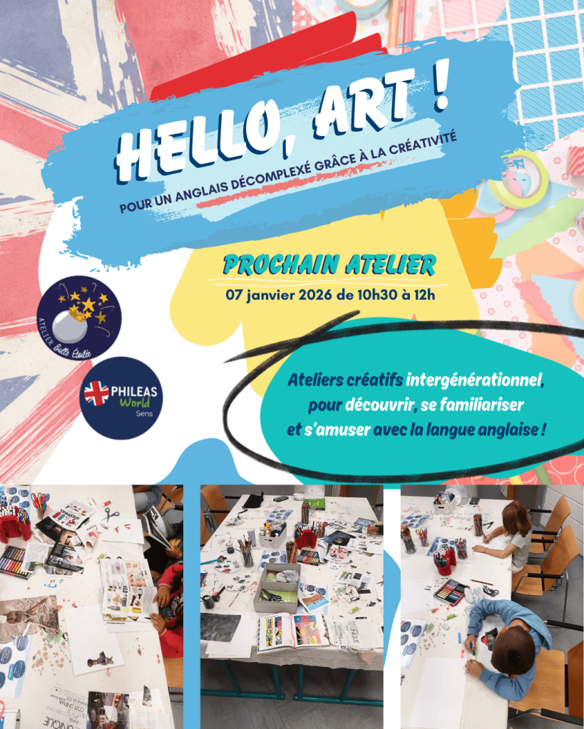 HELLO, ART ! sont des ateliers mêlant anglais et créativité pour enfants dès 6 ans, ados et adultes, et animés par Laura de PHILEAS World Sens et Caroline de l’ATELIER Bulle Étoilée.