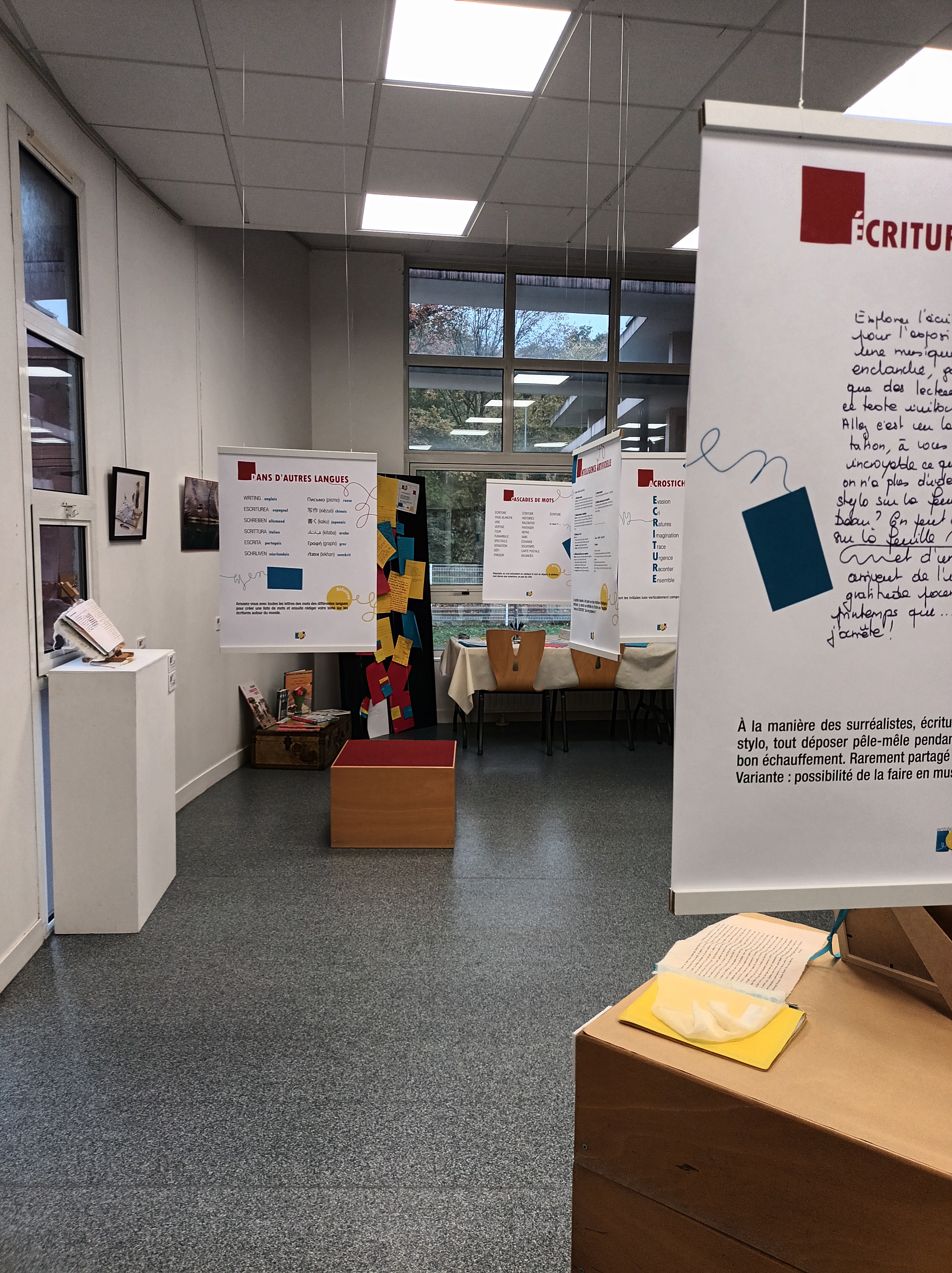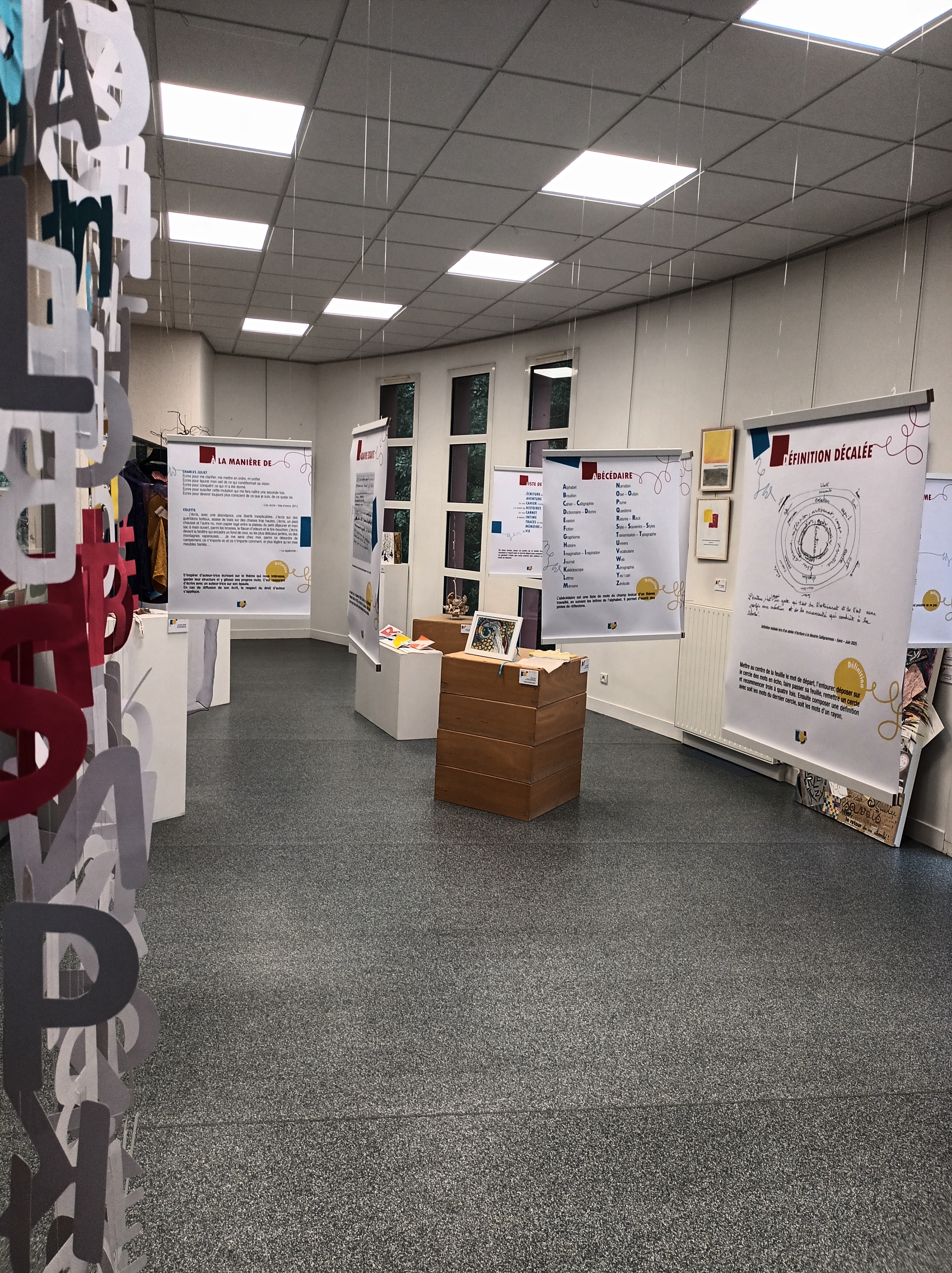 Le visiteur déambule parmi des mots, des formes, des couleurs; les œuvres dialoguent entre elles, un déclencheur d’écriture apporte son étincelle à l’esprit et les idées fusent !